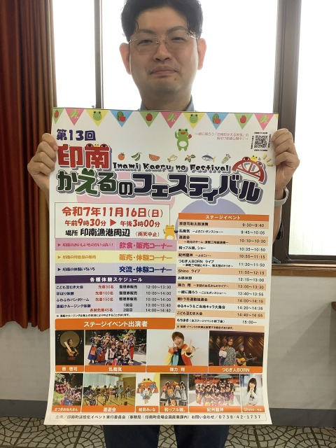 11月16日(日)に印南漁港周辺(雨天中止)で第13回印南かえるのフェスティバルが開催されます。印南の特産品の販売や体験・交流、飲食販売、特設ステージでのイベントなど催しがたくさんです。みなさんのご来場お待ちしてます☺