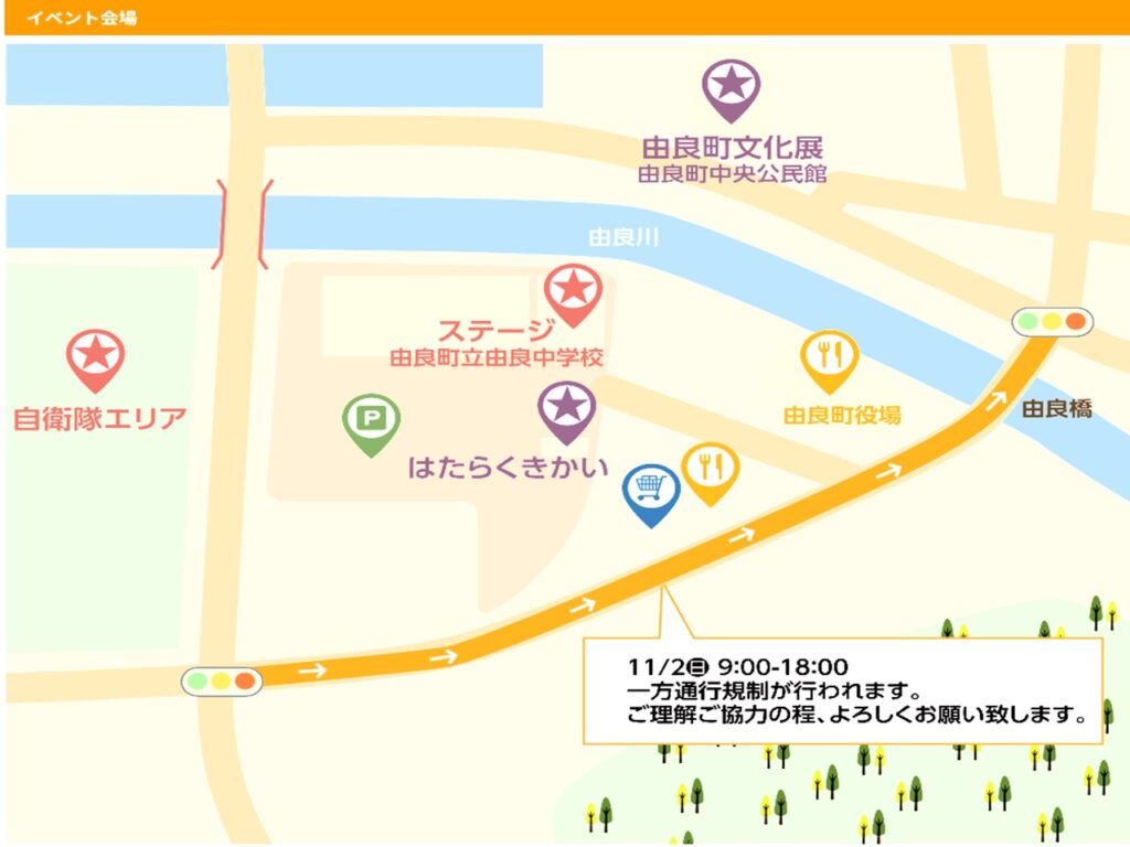 由良町役場前道路は、9:00~18:00まで一方通行規制が行われておりますので、ご注意下さい。
