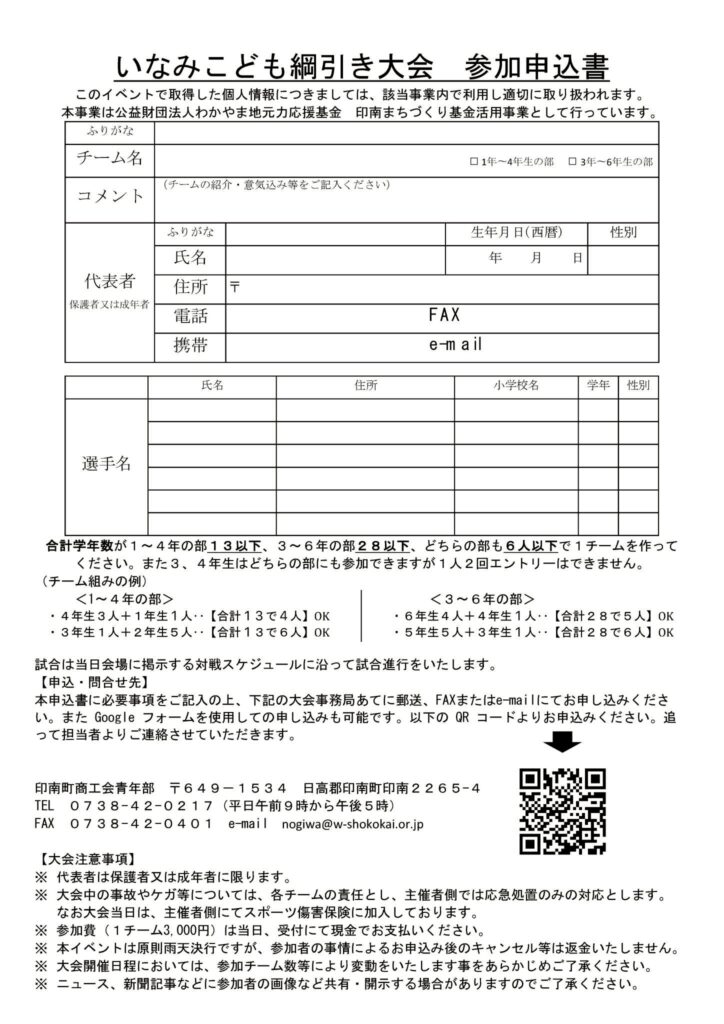 | 参加申込方法 | 申込書に必要事項をご記入のうえ 郵送、FAX、e-mail のいずれかでお申し込みください。 また、Googleフォームからの申込も可能です。 いなみこども綱引大会_参加申し込み |