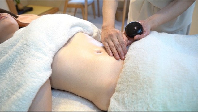 「お腹を揉まれるのって痛いのかな?」とか「お腹をみられるのは恥ずかしい」と少し緊張していましたが、実際ホットストーンをつかっての施術は心地良い温かさで驚くほどソフトでリズミカルな刺激でした。